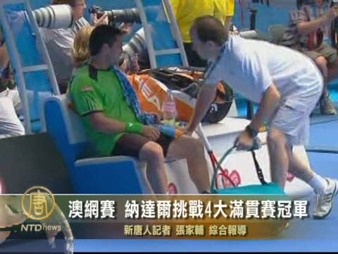 【新唐人2011年1月18日訊】1月18日,全球四大滿貫賽之一的澳網公開賽進入第二天,西班牙球王納達爾因對手受傷棄權, 輕鬆拿下首輪勝利,邁出了他挑戰連續奪得4大滿貫賽冠軍的第一步。