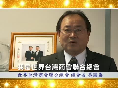 新唐人電視臺的觀眾,大家好,我是世界台灣商會聯合總會第16屆總會長,也是中華民國建國一百週年慶祝活動籌備委員蔡國泰,我們都知道現在世界經濟的中心已經移往亞洲,華人的經濟一片向榮,我希望在經濟繁榮的同時也能夠繼續的發展民主輿自由,在此新年之即,向各位宏圖大展,事事平安,謝謝