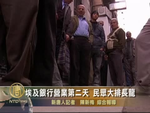 【新唐人2011年2月8日訊】埃及局勢紛擾,銀行在關閉了12天之後,重開大門,但有許多人在前一天沒領到錢,星期一繼續到銀行排隊。一大早就已經有民眾大排長龍在銀行門外等待。
