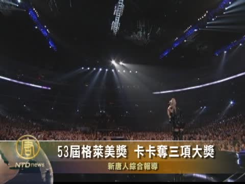 【新唐人2011年2月15日訊】第53屆格萊美獎2月13日星期天晚間在洛杉磯揭曉,今年女神卡卡再度奪獎,拿下最佳流行音樂女歌手等三項大獎。美國鄉村音樂三人組“戰前女神”(Lady Antebellum),意外抱走五座獎項,成為今年格萊美大贏家。