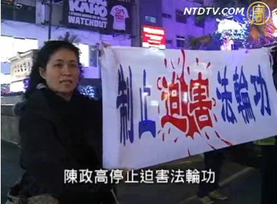 法輪功學員:「制止陳政高,他是遼寧省的省長,長期以來就在中國大陸,迫害法輪功的人,迫害人權,所以像目前我們台灣各省市的議會,都已經通過了禁止這些惡棍來到台灣,結果他今天還能來台灣這片土地,而且還高禮遇的對待,所以我們要讓台灣的人民覺醒這件事。」