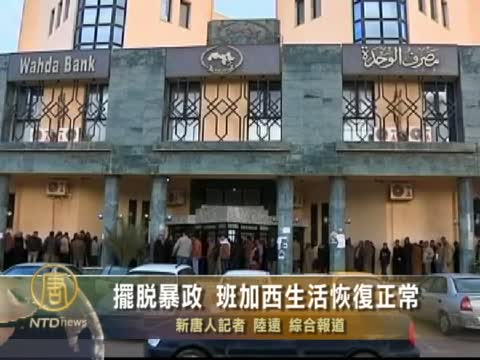 【新唐人2011年2月27日訊】在效忠卡扎非的軍隊逃遁之後,利比亞第二大城市班加西的生活正在恢復正常。星期六,城中的銀行已經恢復營業。