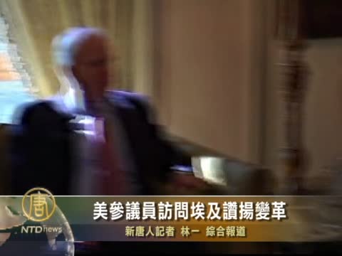 【新唐人2011年2月28日訊】2月27號, 到訪開羅的美參議員馬侃(John McCain) 和利伯曼(Joseph Lieberman)首先會見了埃及臨時政府外長蓋特(Ahmed Aboul Gheit),並訪問了市中心民眾大規模示威、促成穆巴拉克政府倒臺的解放廣場。