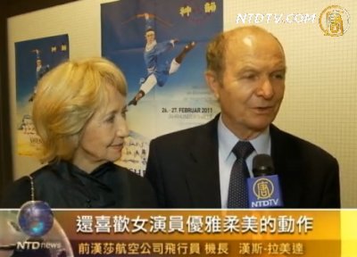 【新唐人2011年3月1日訊】2月27日晚,神韻巡迴藝術團本年度在法蘭克福的最後一場演出在觀眾熱烈的掌聲與依依不捨中圓滿落下帷幕。神韻晚會通過完美的舞臺藝術引領觀眾穿越歷史長河,領略中國神傳文化,這令在漢莎航空公司擔任過30年飛行員的老機長拉美達先生與妻子讚嘆不已。