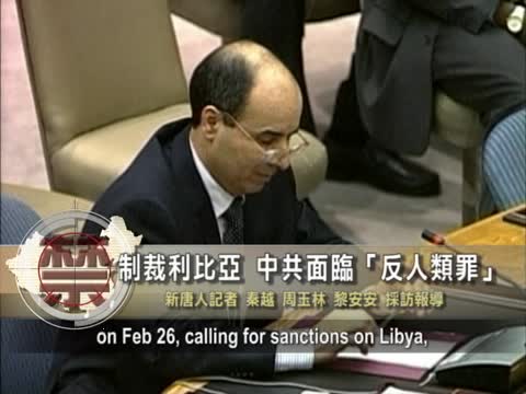 【新唐人2011年3月2日訊】中共一反常態,投票支持聯合國安理會(UN Security Council)第1970號決議——制裁利比亞卡扎菲政府。是甚麽情況讓中共改變“不干涉內政”的態度,最後投下贊成票?而,聯合國制裁的內容包括:利比亞當局涉嫌“反人類罪”,與中共鎮壓“六四”學運相同。中共將如何面對?我們來看看專家的分析。