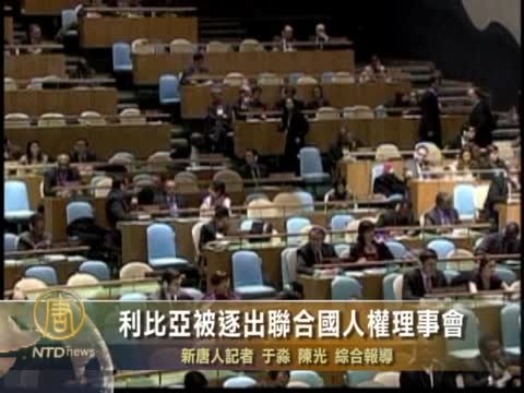 【新唐人2011年3月2日訊】聯合國大會,星期二,投票一致通過決議案,中止利比亞在聯合國人權理事會(U.N. Human Rights Council)的成員資格,以制裁它對反政府抗議民眾的武力鎮壓。