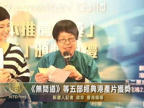 【新唐人2011年3月5日訊】香港電影編劇家協會日前為過去20年來的最佳劇本頒獎,其中劉偉強執導的《無間道》獲得兩項殊榮,除獲選為“觀眾最喜歡劇本獎”,又與《甜蜜蜜》、《新不了情》、《女人四十》及《大只佬》齊獲得“二十週年劇本推薦大獎”。