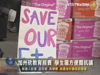 【新唐人2011年3月5日訊】數十名教師及學生將價值三百美元的方便麵擺放在加州州長位於洛杉磯市中心的辦公室大樓前面,抗議州政府計劃刪減教育經費。請看來自洛杉磯的報導。