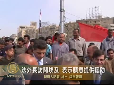 【新唐人2011年3月7日訊】法國新上任的外長阿蘭•朱佩(Alain Juppe)3月6號出訪了埃及抵達首都開羅。朱佩與埃及臨時政府的部分高級官員和阿拉伯聯盟官員會面,他表示只要埃及需要, 法國將提供政治和經濟援助。