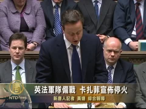 英國首相卡梅倫星期五向國會報告說,英國已立即調動戰鬥機到鄰近利比亞的基地,強制在利比亞執行禁飛區。國際社也會很快的就會對卡扎菲有所行動。