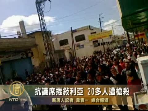 【新唐人2011年3月26日訊】敘利亞安全部隊近來殺害了數十名反政府示威者後,星期五,敘利亞國內要求民主、反對獨裁者阿薩德家族專權的大規模抗議示威席捲全國,據報導,在示威中又有20多民眾被軍隊槍殺。