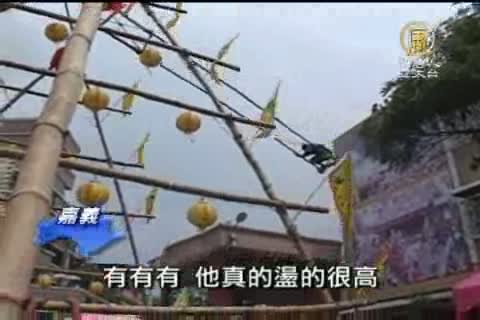 【新唐人亞太台2011年4月6日訊】觀眾朋友知道嗎?盪鞦韆,可以比賽,而且在嘉義一個光路社區的高空盪鞦韆比賽,還已經有兩百多年的歷史,所有選手都必須要在用竹子搭建起來,四層樓高的鞦韆架上比賽,過程驚險刺激,每年都會吸引大批的觀光客,前往觀賞 。