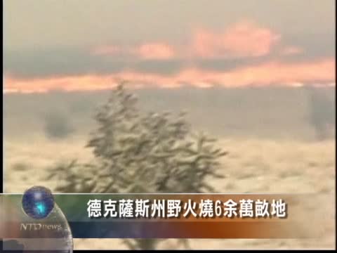【新唐人2011年4月12日訊】德克薩斯州的野火,在週日延燒了6萬英畝(2萬4千公頃)土地之後,週一(4月11號)再燃新火,風助火勢,當天新增過火面積達600英畝(243公頃)。