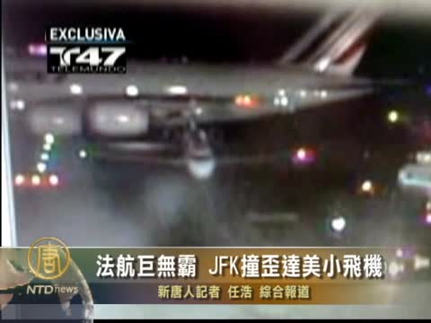 【新唐人2011年4月13日訊】4月11號(星期一)晚上,一架法航空客A380航班,正在甘迺迪機場滑行準備起飛時,左翼剮蹭了 達美航空的一架小型客機的機尾,讓小飛機轉了將近90度,引來一場虛驚。