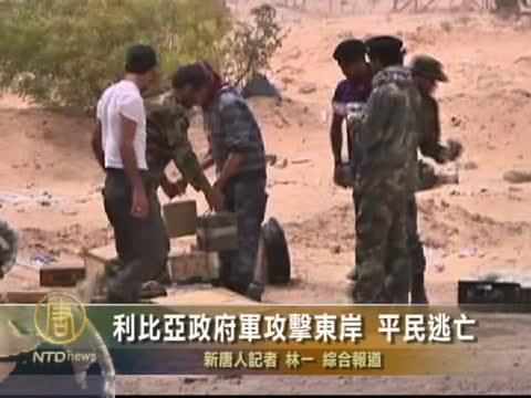 【新唐人2011年4月18日訊】4月17號,卡扎菲政府軍在利比亞東部城市艾季達比耶和重要的石油城市佈雷加發動了大規模反擊, 反政府軍隊由於武裝設備處於明顯劣勢, 抵擋艱難。當地居民大量逃亡至反政府軍控制的班加西城。