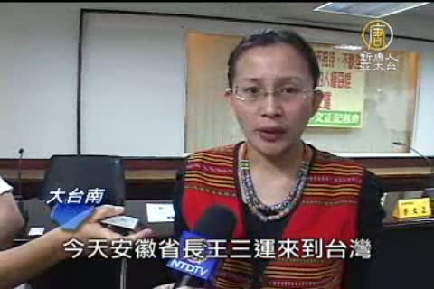 【新唐人亞太台2011年4月20日訊】被控告殘害人群罪的安徽省長王三運,準備在21日以「經貿文化」之名前往台南,不過,多位台南市議員今天(20日)召開記者會表示,台南市不受經濟利益誘惑,不歡迎王三運到台南來,並要求釋放拘押在安徽省勞教所的神韻藝術家的親人。