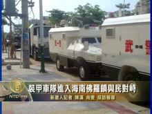 2012-04-18 18:00:08當地民眾抗議建火電廠行動越演越烈。 ,裝甲車隊進入海南佛羅鎮與民對峙
