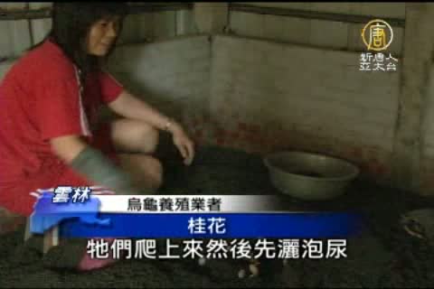 【新唐人亞太台2011年4月28日訊】雲林二崙是台灣少數的烏龜養殖區,養烏龜這門事業真是慢工出細活兒,因為烏龜得七八年才會生一次蛋,還得細心的孵化,如果沒有有耐心可不行,我們的記者為您採訪到二崙的烏龜養殖業者,帶您去了解,佔台灣外銷市場一席之地的產業。