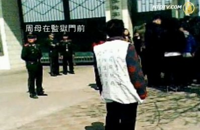 周母無奈穿上了白布做的大坎肩,站在監獄門外抗議,引起很多路人圍觀。她向人們介紹,她兒子信仰『真、善、忍』是個好人,在單位是工程師,有人給她兒子送禮,送了一書包錢,他都不要。
