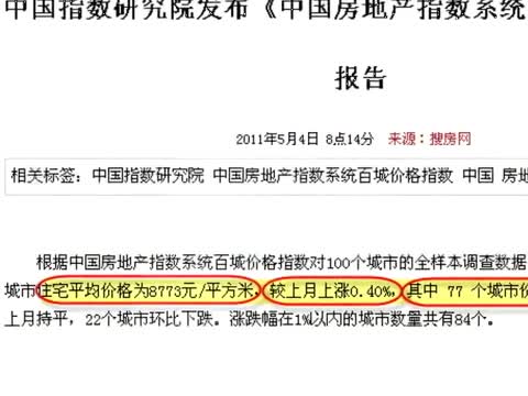 【新唐人2011年5月7日訊】中國指數研究院4號公布的百城價格指數調查,4月份中國全國100個城市的住宅價格,較3月上漲0.40%﹔專家指出,中國總的經濟結構不改變,地方財政若繼續依賴賣地,房價就下不來。