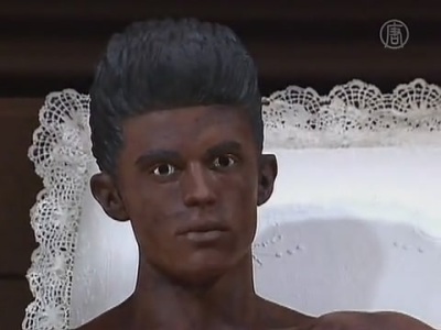 The room contains a desk, a lamp and a sculpted figure of model Baptise Giabiconi, posing on a chocolate bed with a chocolate ice cream bar.
