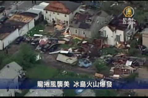 【新唐人亞太台2011年5月23日訊】星期日(5月22號)龍捲風襲擊了美國堪薩斯州東北部,共造成一人死亡,五人受傷,以及約200間房屋損毀,16個縣進入緊急狀態。而在冰島,當地最活躍的格裡姆火山冒出火山灰,造成冰島重要機場關閉,專家表示,這次爆發的規模超出預期。