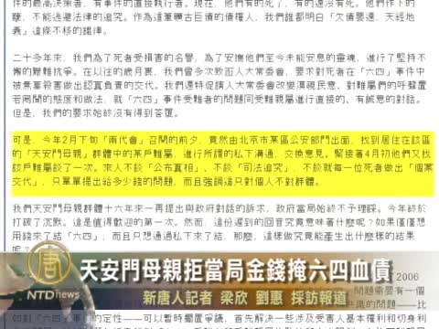 【新唐人2011年6月2日訊】“六四”慘案22週年臨近之際,中共打破以往的瀋默,向這些被稱爲“天安門母親”的“六四”遇難者親屬探風,問多少錢能解決問題,但是不談真相不認責任,遭到天安門母親們的鄙視。她們發表公開信表示,拒絕任何褻瀆“六四”亡靈及其難屬人格尊嚴的做法,要求還原事實真相,追究當局責任。