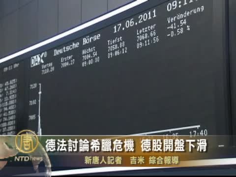【新唐人2011年6月17日訊】星期五(六月十七日),德國總理默克爾(Angela Merkel)與法國總統薩爾科齊在柏林舉行會議,針對希臘債務危機討論新的援助方案細節。德國股市開盤下滑。