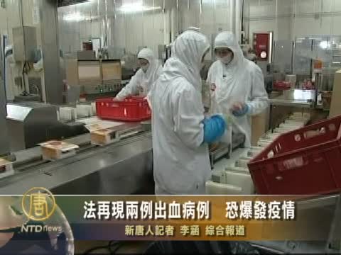 【新唐人2011年6月18日訊】6月17號,法國健康部長表示,又發現了兩例由於食用不潔的肉類製品,感染大腸桿菌的病例。到目前為止,法國一共發現了9例患者,其中一人病情惡化。6月16號,法國健康官員表示,擔心大腸桿菌疫情在法國爆發。