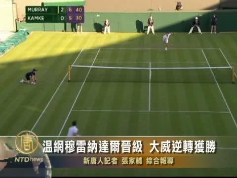 【新唐人2011年6月23日訊】星期三,受到大雨延誤,溫布頓網球賽繼續進行第二輪賽程。 英國的選手穆雷和西班牙球王納達爾成功晉級﹔女子組方面,大威廉姆斯對上日本老將伊達公子打出一場精彩好球,最終大威廉姆斯逆轉獲勝,進入第3輪。