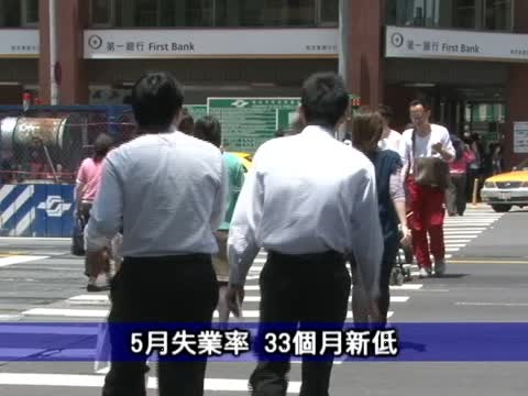 行政院主計處今天公布5月失業率為4.27%,較4月下降0.02個百分點,也較去 年5月下降0.87個百分點,是近33個月最低水準。