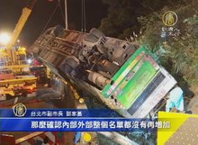 2017-02-15 17:24:42早安新唐人,先帶您關心,元宵假期後的第一天,昨天晚間9點12分,國道5號接國道3號轉彎處,發生遊覽車翻覆重大事故,就在稍早,已經上升到33死11傷;這是一個 賞櫻國旅長青團,從武陵農場返回台北時發生不幸;有消息指出,司機曾經反應過疲勞駕駛,但都未獲得公司回應。檢警已經連夜進行蒐證,今天上午承辦的蝶戀花旅行社也將出面說明。首先帶您了解案發現場。