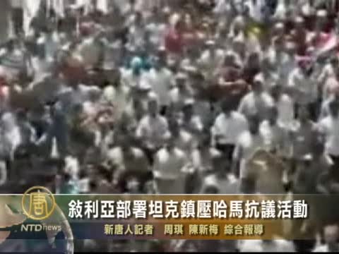 【新唐人2011年7月4日訊】星期日(7月3日),據居民和活動分子敘述,敘利亞坦克部署在哈馬市入口,目擊者表示兩天前他們看到了三個月來對總統阿薩德的最大抗議。