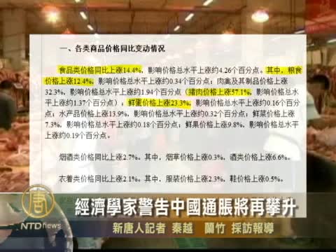 根據中共國家統計局發佈的數據,6月份食品價格漲幅達14.4%﹔其中糧食價格上漲12.4%,鮮蛋價格上漲23.3%,豬肉價格上漲最厲害,高達57.1%,食品價格不斷向上攀升使得一般中國百姓直呼:不但買不起房,不敢生病,現在連三餐也難保證。