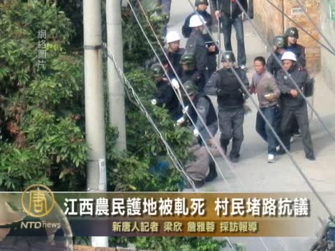 【新唐人2011年7月12日訊】11號,江西省贛縣茅店洋塘工業園裡,一名阻擋強拆的村民謝紹椿,被挖掘機活活軋死,身首異處。當晚,上千名憤怒的村民在園區旁的公路上抗議﹔許多民眾被趕到現場鎮壓的大批武警打傷,十幾位死者的親屬和村民被警察抓走。
