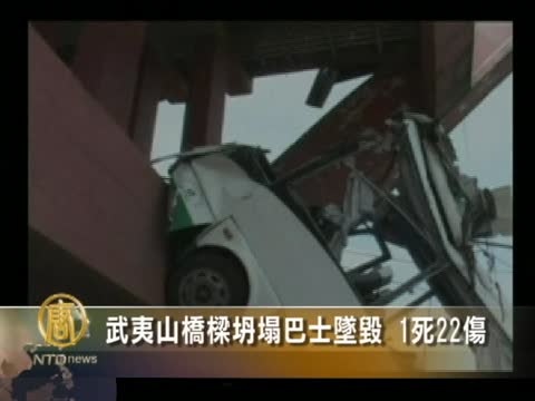 【新唐人2011年7月15日訊】星期四(7月14日)上午8點50左右,中國福建省武夷山縣的一座大橋發生坍塌,造成一輛巴士墜毀,司機當場死亡,車上22名乘客受傷。