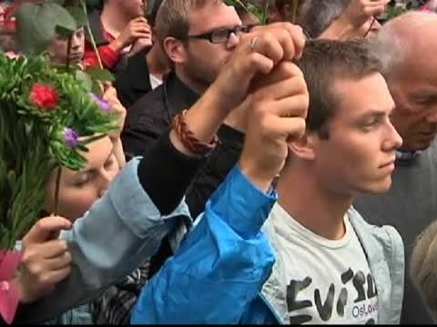十萬多挪威人,手持鮮花和國旗,聚集在奧斯陸市中心週五爆炸案的發生地,向遇難者致哀,同時呼籲反對暴力。包括挪威國王哈拉爾五世(King Harald)、王儲哈康王子(Crown Prince Haakon Magnus)、首相斯託爾滕貝格(Jens Stoltenberg)都參加了集會。