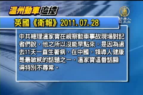 【新唐人亞太台2011年7月29日訊】在溫州動車追尾事件發生後第六天,中共國務院總理溫家寶露面,並在事故現場召開中外媒體記者會,他先解釋自己是因為生病所以直到災後第六天才前往慰問。接著在回應媒體提問時,再三重申將「嚴肅追究」事故責任人的責任而且拿出一個經得起歷史檢驗的事故調查結果。英美報紙如何評論這場露天、在災難第一現場舉行的中外記者會?帶您快速瀏覽。