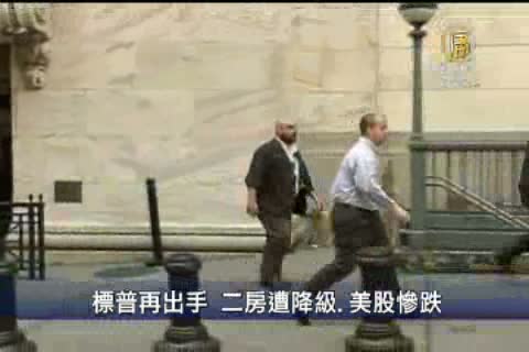 【新唐人亞太台2011年8月9日訊】繼下調美國主權信用評等之後,標準普爾再次行動,週一(8號)發表聲明,將美國房地產抵押貸款兩巨頭房利美和房地美信用評等由AAA降至AA+,引發股票市場恐慌性賣壓,讓美股普遍跌幅超過5%。