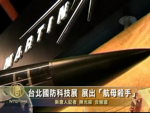 【新唐人2011年8月11日訊】台灣「2011年臺北國際航太科技暨國防工業展」星期四開幕。展示區中,一枚超音速反艦導彈格外引人注目。導彈背景板上書寫著「航母殺手」,而這恰逢中國大陸第一艘航空母艦試航的翌日。