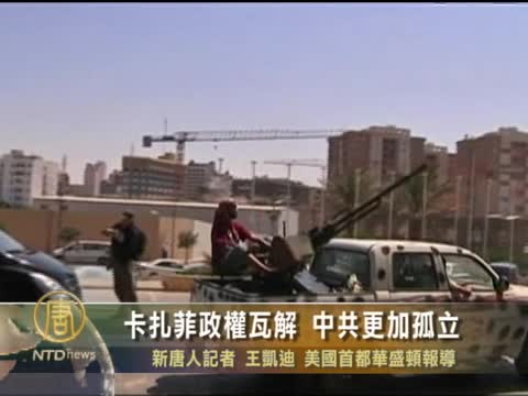 【新唐人2011年8月26日訊】目前,利比亞反對派武裝已經掌握了首都的大部分地區,並在追捕卡扎菲和他兒子們。有關專家認為,卡扎菲政權的倒臺,將會極大地促進敘利亞阿薩德政權的瓦解,也令中共在國際上更加孤立。