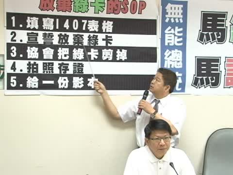 民進黨團幹事長蔡煌瑯:「第三協會把綠卡剪掉,第四拍照存證,第五給1份影本放棄,這樣的SOP,馬英九連一項都沒有做,他只有用非移民護照進出美國,就表示他放棄移民護照,這是胡扯。」