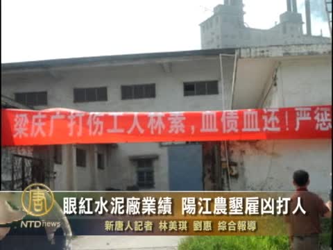 【新唐人2011年9月14日訊】10號上午,在廣東省陽江市潭水鎮,二、三百名手持兇器的身份不明者闖入陽江三馬水泥廠,追打護廠工人,導致十多人受傷,其中一人重傷。據知情者披露,陽江農墾局強行收回三馬水泥廠,使工人們面臨失業,是引發這次衝突的原因。