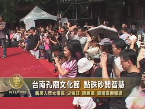 【新唐人2011年9月25日訊】臺南市今天在孔廟文化園區舉行「2011孔廟文化節」開幕典禮,安排100多名小學一年級新生接受「點硃砂開智慧」,還有名書法家墨寶贈送,國小學生學習六佾舞等活動。