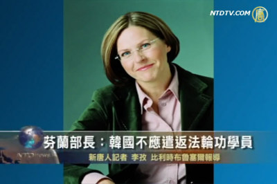 【新唐人2011年9月30日訊】針對韓國政府強行遣返法輪功學員回中國事件,芬蘭國際發展部長海蒂·郝塔拉9月28日在布魯塞爾接受本臺記者採訪時表示,任何一個政府都不應該遣返法輪功學員回中國。請看報導。