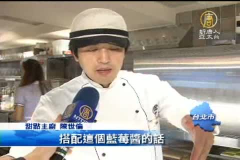 甜點主廚 陳世倫:「這一道甜點是藍莓凱莉風,我就把它弄成好像名媛在逛街的感覺。吃起來的口感滿滑順的,搭配這個藍莓醬的話,它會酸甜又滑順入口。」