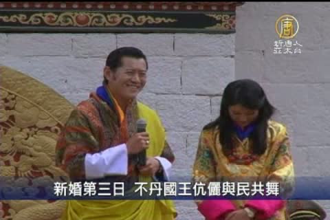 【新唐人亞太台2011年10月16日訊】星期六(10月15號),新婚第三天的不丹國王旺楚克和新科王后貝瑪,在首都辛布的主體育場,跟近3萬平民一同歡慶、跳舞。期間,國王當眾三次親吻了王后。