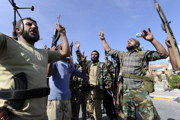 星期五(10月21日),一批利比亞臨時政府的軍隊士兵,聚集在蘇爾特高速公路卡扎菲被俘的現場,慶祝被他們稱為「鼠輩」的卡扎菲的徹底垮臺。