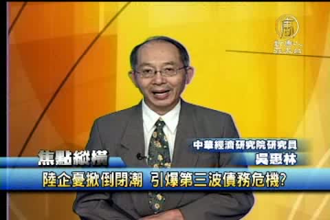 【新唐人亞太台2011年10月27日訊】全球經歷美國次貸風暴、歐債危機,已經有專家預測,第三波債務危機,將在中國引爆。中國的中小企業重鎮溫州,今年以來已經有80多家企業倒閉,如果企業倒閉潮持續,將造成民間借貸資金鏈斷裂,最後拖累銀行體系。其實,今年廣交會上, 81%的企業看衰明年的工廠倒閉潮將更為嚴峻,如何解讀這波陸企倒閉潮的原因?台灣如何因應?今天的焦點縱橫為您解析。