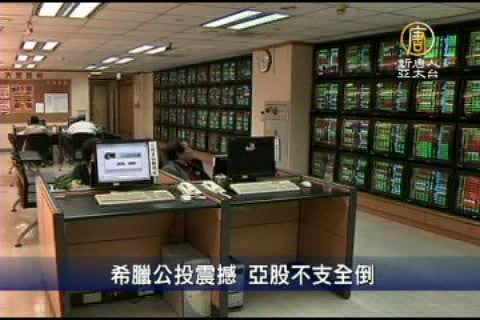 【新唐人亞太台2011年11月2日訊】好,那麼希臘跌破市場眼鏡,宣布將把歐洲紓困案付諸公投,不但拖累前夜歐美股市重挫,亞洲股市在今天上午也是接棒慘跌。帶您來看到,東京股市挫跌1.73%,雪梨股市下跌0.74%,首爾股市挫1.26%,香港股市挫0.92%,上海股市挫1.00%。而台股方面,則是開低大跌超過百點,早盤電子、金融、傳產股全盤皆沒。不過,盤中面板二虎由黑翻紅,推動盤勢緩步向上。集中市場終場只有小跌23點,以7598點作收,收盤量954億元。針對亞股普遍慘跌,日本財務大臣安住淳今天表示,希臘公投計畫「把大家搞糊塗了」。台灣央行總裁彭淮南